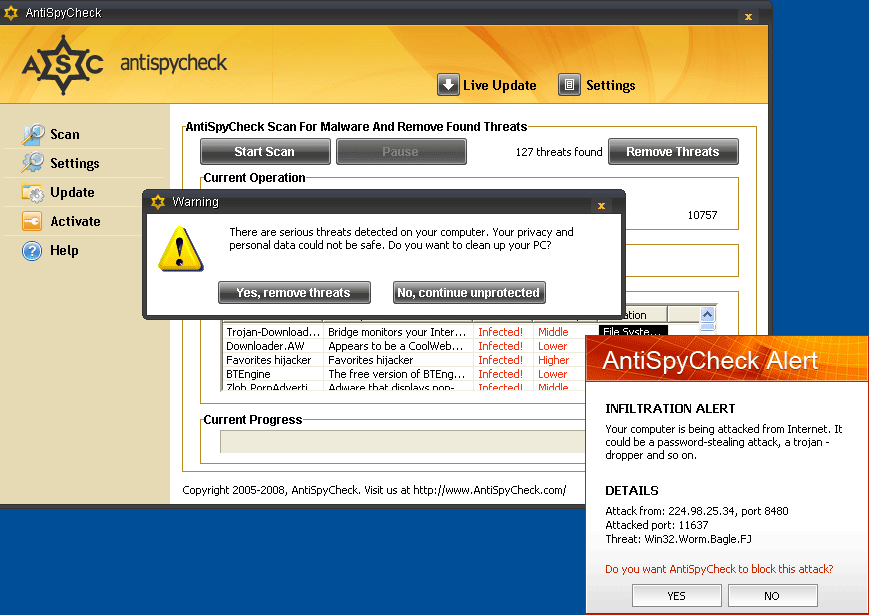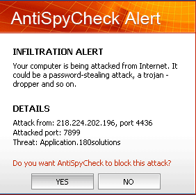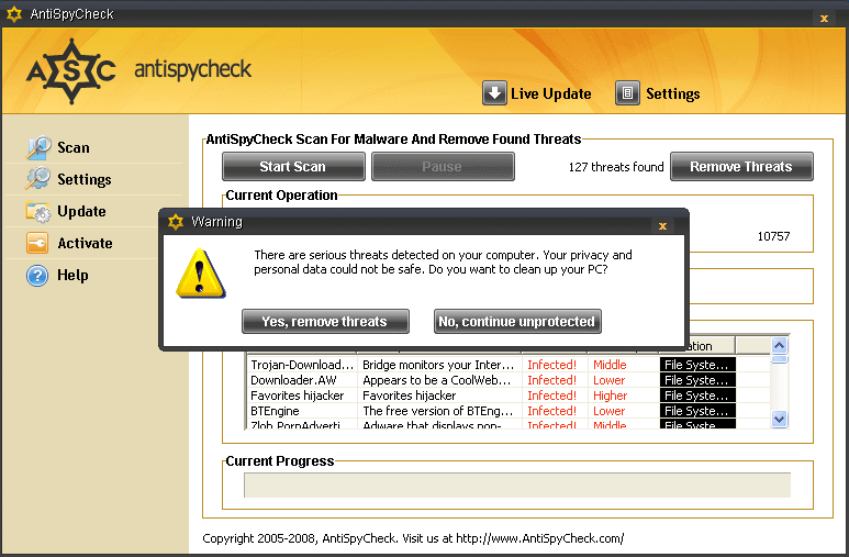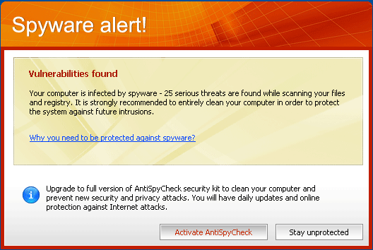 AntiSpyCheck is a rogue anti-spyware application that is usually downloaded and installed onto your computer by a Trojan finding its way through browser security holes. As soon as it is installed it will display notifications of non-existent security and privacy risks and try to trick you into buying the full version. This program may slow down your system and cause its instability. AntiSpyCheck can be highly difficult to remove manually.![]()