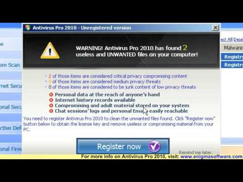Antivirus Pro 2010, the newest member of the family, displays fictitious and sometimes grossly exaggerated infection results, along with false security scan results and fake security alerts, in order to trick users into purchasing and downloading this fake spyware remover.
