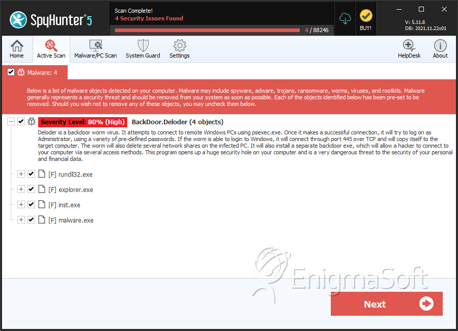 Deloder is a backdoor worm virus. It attempts to connect to remote Windows PCs using psexec.exe. Once it makes a successful connection, it will try to log on as Administrator, using a variety of pre-defined passwords. If the worm is able to login to Windows, it will connect through port 445 over TCP and will copy itself to the target computer. The worm will also delete several network shares on the infected PC. It will also install a separate backdoor exe, which will allow a hacker to connect to your computer via several access methods. This program opens up a huge security hole on your computer and is a very dangerous threat to the security of your personal and financial data.