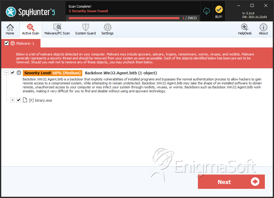 SpyHunter Detects & Remove Backdoor.Win32.Agent.bitb