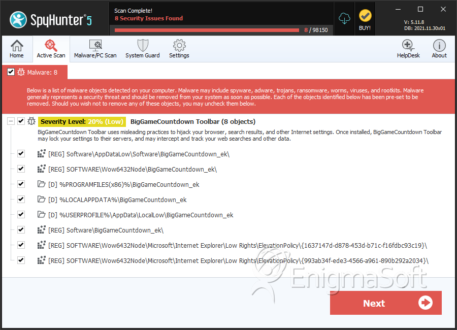 SpyHunter Detects & Remove BigGameCountdown Toolbar