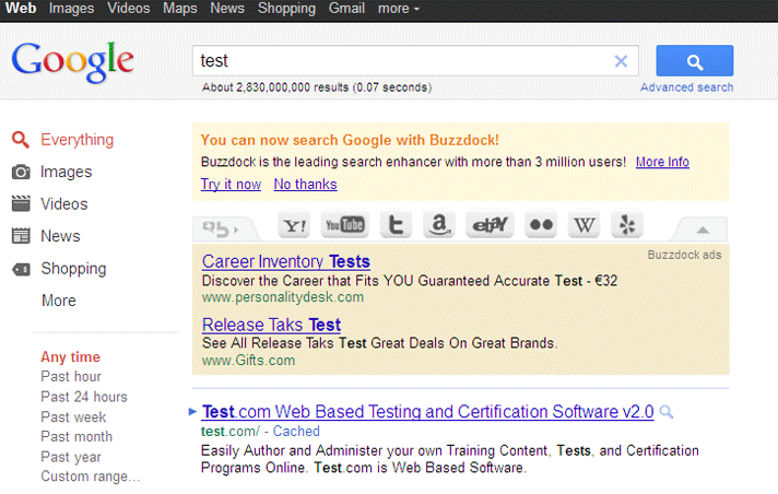 Buzzdock Ads is an adware which contains an add-on for the Internet browser. Buzzdock Ads was made possible with Addict-Thing plug-in. Buzzdock Ads is registered as Addict-Thing Class on the Internet browser and works as a browser helper object (BHO). Buzzdock does not take over the home page of the corrupted web browser. Buzzdock Ads does not change the search results and reroute them to suspicious websites as most of usual unwanted add-ons. Buzzdock Ads will not show up for typical web browsing activity; it will only be visible when a computer user performs a search. Buzzdock Ads gets visible on top of the search results showing relevant advertisements. There is an option to close and disable Buzzdock Ads right below the advertisement block; however, it does not guarantee that it can be completely eliminated from the targeted PC.