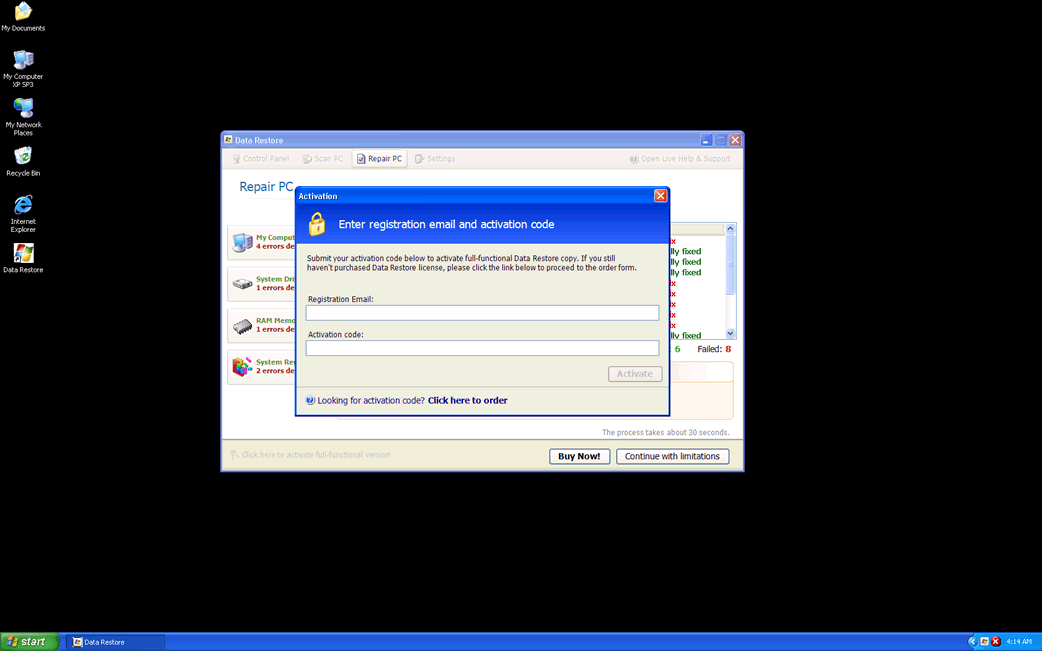 The most obvious symptom of a Data Restore is the presence of constant, alarming error messages from your computer system and from Data Restore itself. These error messages will try to convince you that there is something severely wrong with your computer, ranging from the plausible (there are some disk errors on your hard drive) to the impossible (such as being unable to detect your C: drive, despite your operating system and Data Restore itself being located on this device). Clicking on any of these error messages or on the fix errors button on the Data Restore main interface, takes the victim to a page for entering one's credit card number. Data Restore claims that only its 'full version' can fix all of these nonexistent problems on the victim's computer. Despite its claims to speed up your computer system, a Data Restore infection actually slows down your computer tremendously. Data Restore consumes system resources and runs continually in the background. It is also not programmed very efficiently. Even worse, Data Restore does not play well with many Windows services and common applications. This means that a computer infected with Data Restore will crash frequently. However, this is actually advantageous to Data Restore since it reinforces the illusion that the victim's computer has a severe problem. The problem, in fact, is Data Restore itself.![]()