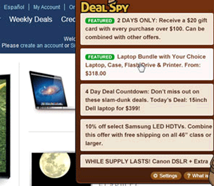 Deal Spy is a potentially unwanted program/adware, which is generated by 215 Apps. Deal Spy will show pop-up ads, savings coupon, and deals on the screen of the compromised PC while the computer user is browsing the web. Deal Spy will emerge as a small box on upper right corner of the hacked web browser when the Internet users visits online shopping websites. Deal Spy emerges as a small button that, if clicked, will reveal the contents showing links for a variety of offers. Deal Spy usually installs a browser add-on on Internet Explorer, Google Chrome, and Mozilla Firefox. Deal Spy may come packaged with free programs that web users have downloaded from various websites. When the computer user is installing the particular tool, he/she also unknowingly loads Deal Spy or other types of adware without consent.