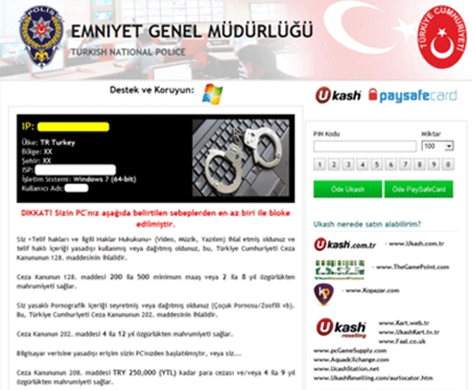 The Emniyet Genel Mudurlugu Ransomware is designed to block the victim's access to the infected computer. Once installed, the Emniyet Genel Mudurlugu Ransomware displays a fake message from the Turkish police. This notification alleges that the infected computer was involved in illegal activities. Then, the Emniyet Genel Mudurlugu Ransomware demands payment of a penalty in money and intimidates the victim with imprisonment unless that fine is paid through Ukash or another money transfer service.![]()