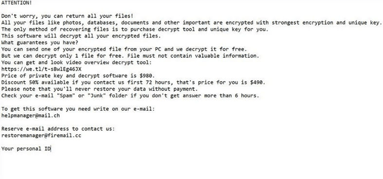 The Erif Ransomware will drop a file on the victim’s computer. The file contains the ransom message of the creators of the Erif Ransomware. The name of the files is ‘_readme.txt.’ In the ransom note, the attackers list the demanded ransom fee - $980. However, according to the ransom note, users who get in touch with the attackers within 72 hours will receive a 50% discount, which means that they would have to pay $490. The attackers provide two emails as a means of contacting them – ‘helpmanager@mail.ch’ and ‘restoremanager@airmail.cc.’ The Trojan creators offer to decrypt one file for free provided that it does not contain valuable data.