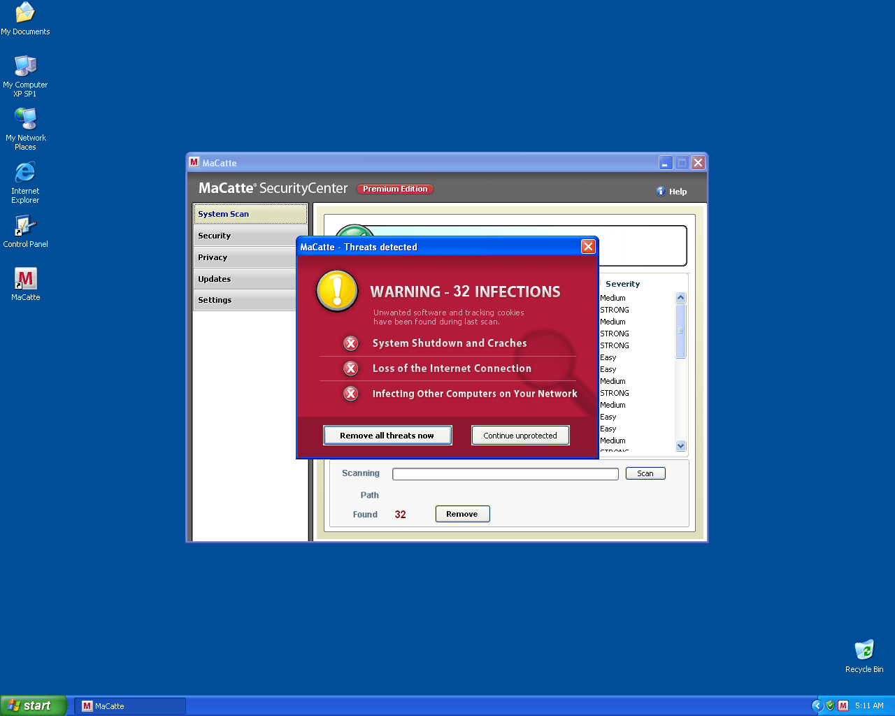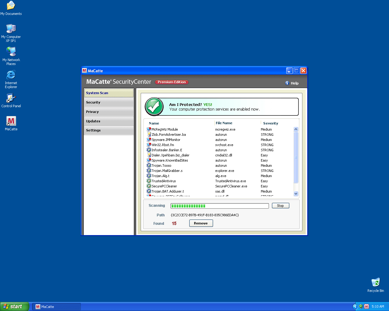 El MaCatte Antivirus 2009 es una aplicación fraude contra software espía, incapaz de detectar o de eliminar parásitos informáticos, que imita al programa de seguridad McAfee. Si está instalado en su sistema, observará que, de acuerdo con los análisis, en su sistema existen muchos parásitos. Cada uno de estos parásitos es inexistente. El MaCatte Antivirus 2009 no es un programa de seguridad de confianza.