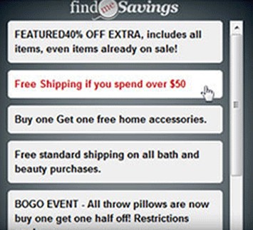 Find Me Savings is an adware application that may target online shoppers by displaying pop-ups offering various coupon savings and online shopping deals. Find Me Savings is known to display a pop-up with several deal links that may redirect users to unwanted sites or ones that attempt to offer additional online deals. The Find Me Savings pop-up messages may be stopped only after Find Me Savings is removed. Usually removal of Find Me Savings is accomplished through an antispyware application.