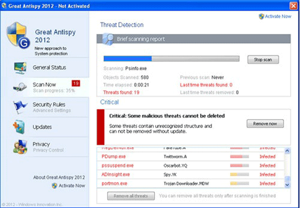 Great Antispy 2012 is one of the many fake anti-spyware applications that criminals use in order to scam inexperienced computer users. When the infected computer starts up, Great Antispy 2012 runs a fake scan of the infected computer's hard drives, invariably showing that the victim's computer is severely infected with malware. Great Antispy 2012 will also display numerous error messages and bogus system alerts to convince the victim that their machines are severely compromised. This is part of a well known scam that criminals use in order to sell fake anti-spyware software to unsuspecting computer users. ESG security researchers have issued a warning about Great Antispy 2012; if this fake security program is installed on your PC, it is crucial to recognize Great Antispy 2012 for what Great Antispy 2012 is. Rather than following any of Great Antispy 2012's recommendations, ESG security researchers recommend using a real anti-malware application to remove Great Antispy 2012 from your computer.