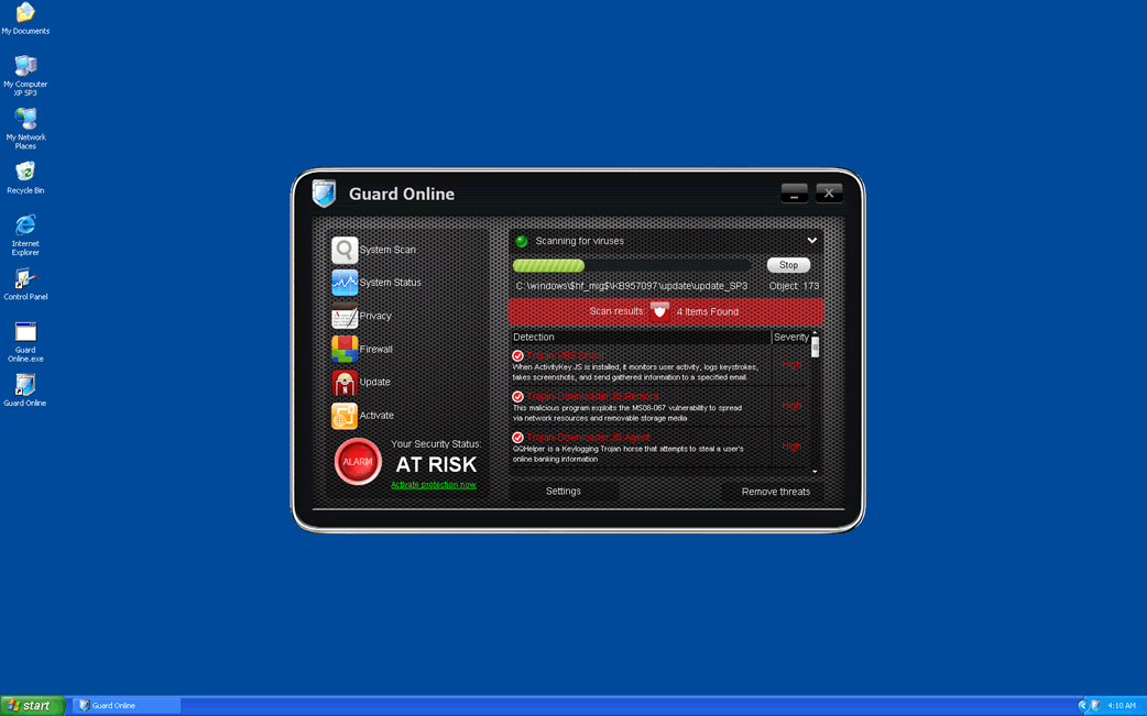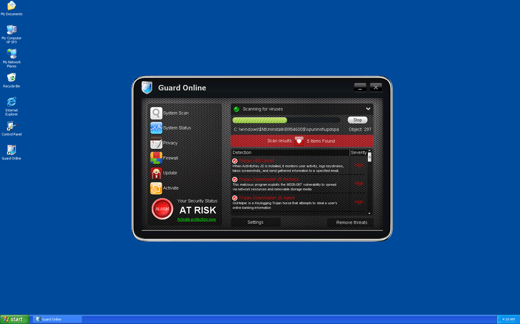 Guard Online is a rogue anti-spyware program that is part of a well-known computer scam. Guard Online belongs to a large family of fake anti-spyware programs known as the WinAVPro family of rogue security programs. Rogue security programs in this family, such as OpenCloud Security and OpenCloud Antivirus, are closely related to the ZeroAccess rootkit, something that makes them particularly dangerous. Typically, Guard Online is distributed through attack websites, which take advantage of security vulnerabilities in your Internet browser or operating system in order to force your computer system to download and install a Trojan infection. If your computer system has become infected with Guard Online, ESG PC security researchers strongly recommend ignoring all of this programs security alerts and error messages. Guard Online is not a real security program; Guard Online is designed to steal your money and cause problems on your computer system. ESG malware analysts recommend removing Guard Online with a real anti-malware application.