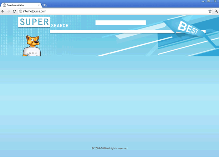 Internetpuma.com is a search engine associated with browser hijackers. While Internetpuma.com is not a particularly dangerous website not having any attack capabilities and with barely any spam-delivery functions (which may change in the future), the Internetpuma.com domain is closely linked to dangerous malware. Internetpuma.com has various clones such as creditpuma.com and foodpuma.com. All of these fake search engines feature a picture of a badly-drawn cartoon puma wearing a suit and sunglasses, a web page that seems unfinished and the generic name 'Super Search'. Redirects to Internetpuma.com and its clones may be caused by a number of sources, often dangerous Trojan infections that can take over an entire operating system. However, one of the main causes of redirects to the Internetpuma.com domain, as well as to the domains corresponding to its clones, is a JavaScript Trojan that can often be acquired by visiting a website that has been compromised. This makes malware associated with Internetpuma.com particularly far-reaching, since it has the potential to cause redirects in operating systems that are normally considered being immune to malware, such as Apple or Linux devices. In fact, redirects to Internetpuma.com and its clones have been reported on iPads, making this attack a matter of concern for PC security analysts.