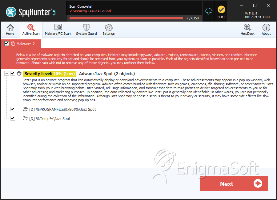 The Jazz Spot adware may connect to its servers over unencrypted channels and download potentially corrupted updates to its components. The updates of Jazz Spot may contain third-party applications like FreecauseTB and IBryte that may slow down your computer. The Jazz Spot adware may use JavaScript to inject additional inline ads and banners on your favorite sites and substitute the safe ads on Amazon and eBay with links to suspicions online retailers. The Jazz Spot adware may use ActionScript3 to show notifications that you won a prize and need to fill in your physical address, email and age, but you should not be fooled. The Jazz Spot adware may supply that information to marketers, and you may be required to complete a short survey to receive your award. Computer users that are infected with the Jazz Spot adware will not receive awards for completing surveys and may be suggested to visit untrusted domains. You should install a reliable anti-spyware solution to delete all files associated with the Jazz Spot adware.
