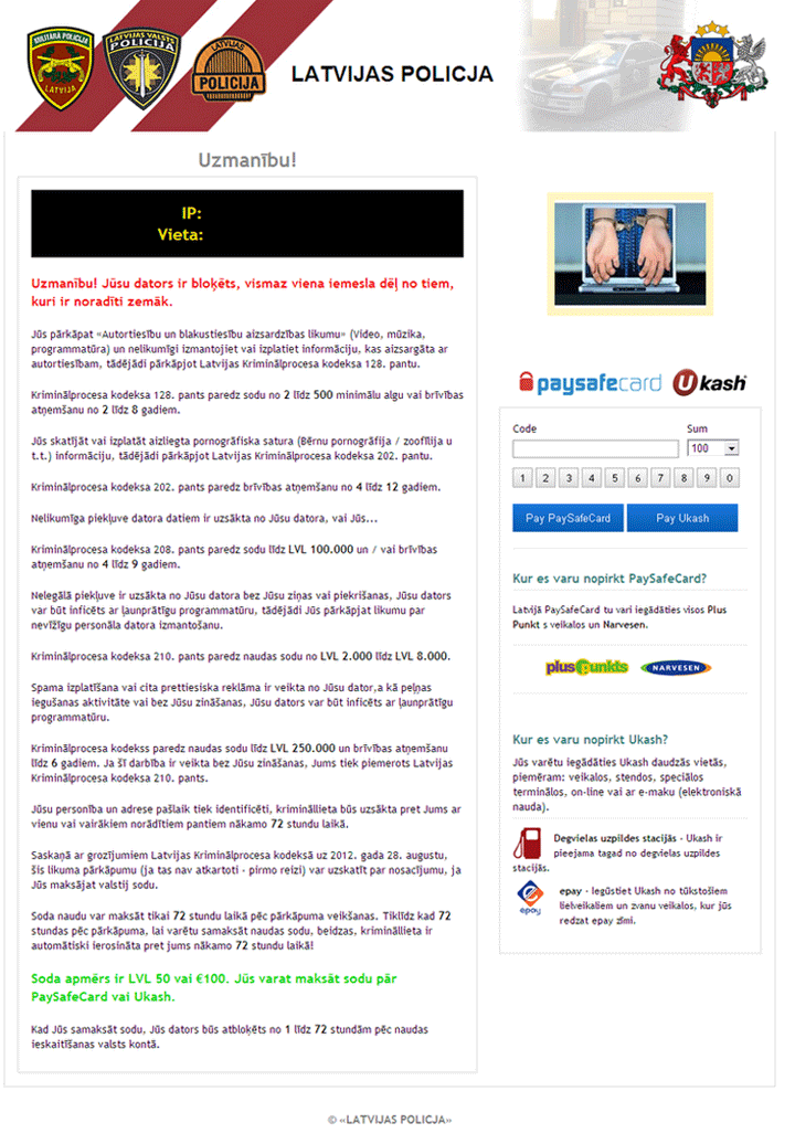 ESG malware analysts have observed that ransomware Trojan attacks in Eastern Europe have increased in the last couple of months. The Latvijas Policijas Virus is one of the many newer variants of the PaySafeCard or Ukash ransomware Trojans that have started targeting these countries. As of November of 2012, ESG security researchers have received reports of ransomware infections impersonating police agencies from Hungary, Romania, Slovenia and other Eastern European countries. The Latvijas Policijas Virus is the variant of this ransomware family that targets computers located in Latvia. This malicious ransomware infection detects the victim's location by its IP address and installs a variant of this scam that corresponds to the victim's computer. These are typically referred to as 'Ukash' ransomware Trojans because they often demand the payment of a ransom using this money transfer service.