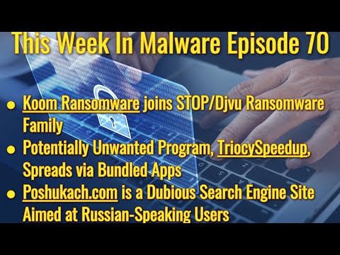 This episode discusses the following topics: The Koom Ransomware threat joins the popular and dangerous STOP/Djvu family of threats, TriocySpeedup discovered to be a potentially unwanted program that may be spread through bundled software, and how Poshukach.com is a bogus search engine site targeting Russian-speaking computer users.