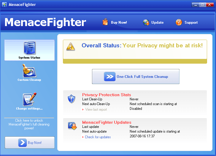 MenaceFighter is a fake anti-spyware remover that is designed to trick you into purchasing the full version of the software in order to protect your computer against the various fictitious infections that are displayed in the misleading pop-up security alert notifications issued by MenaceFighter itself. MenaceFighter may also download and install additional spyware applications and Trojans, affording your computer great risk. MenaceFighter is a clone of WinAntivirusPro2007, and WinFixer.![]()