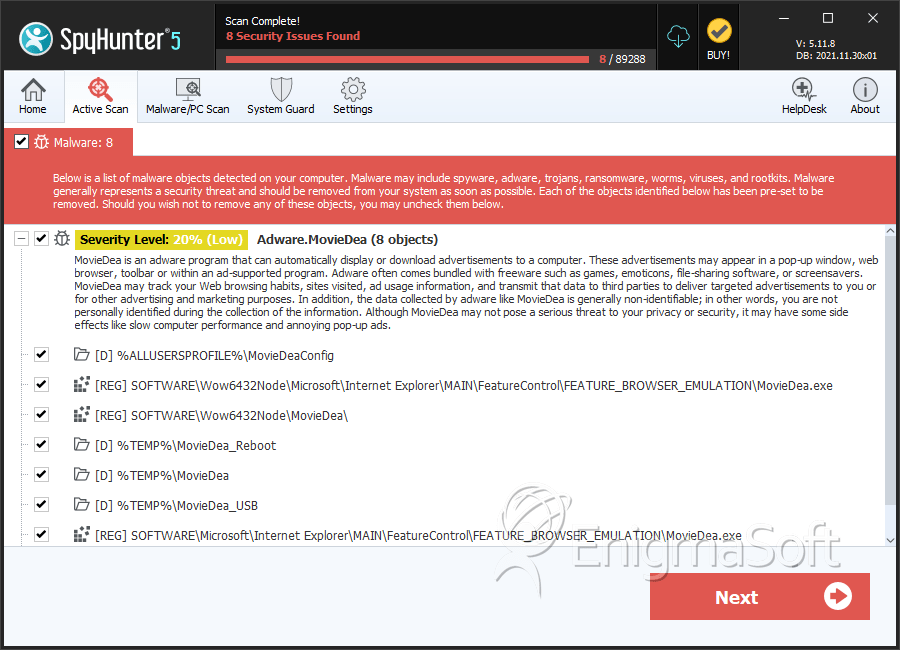 The MovieDea software is promoted as your number one place to search for movies, watch trailers and comment with friends. The MovieDea software functions as a gateway to content from third parties and features advertisements that can be placed within the windows of MovieDea and on pages you visit. The MovieDea software may appear as a browser add-on, extension, a plugin and a Browser Helper Object. Security investigators recognize the MovieDea software as a Potentially Unwanted Program (PUP) that may decrease your Web browser performance and redirect you to potentially compromised online resources. The MovieDea software may arrive on your computer as an additional offer to a freeware package. The MovieDea program may edit your Windows Registry to start at boot-up and work with your Web browser. The MovieDea program may use banners, pop-up windows, and ad-boxes to present you with content from advertisers. The MovieDea app may use tracking cookies, web beacons, and DOM storage data to generate tailor-suited ads. Users of the MovieDea program may be suggested to install rogue registry cleaners like Safe PC Cleaner and RegistryQuick that may cause system errors to convince you to pay for a premium license. As stated above the MovieDea program is not one of the best solutions for video management, and you may want to remove it. Computer users can take advantage of the features that a reputable anti-spyware tool to delete all files of the MovieDea program.