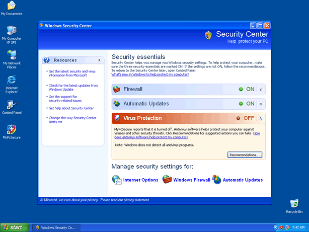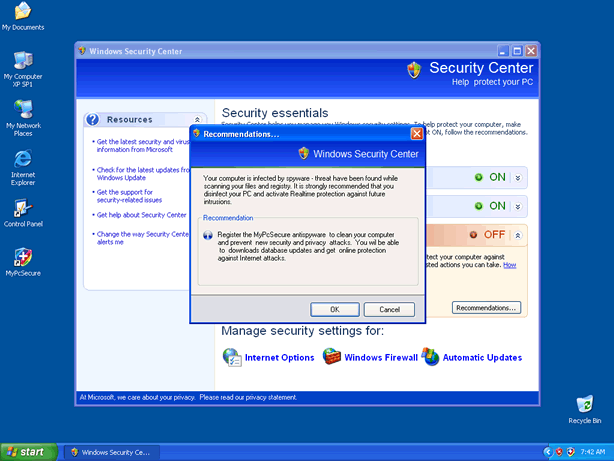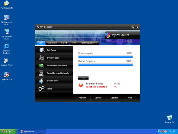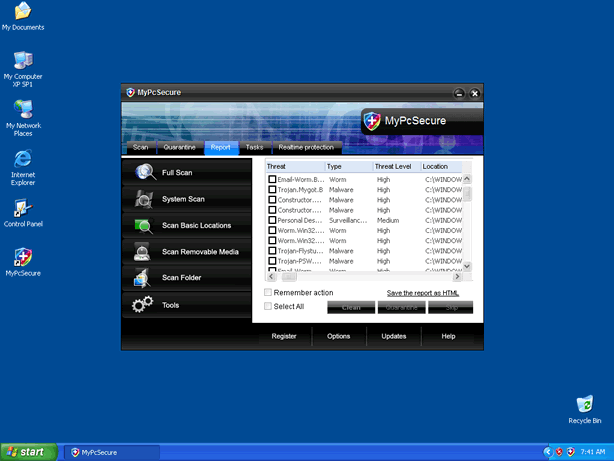 MyPcSecure is a fake anti-spyware program that secretly enters victims' systems and creates a start-up entry in the Windows registry. Once inside a system, MyPcSecure will run bogus system scans and display pop-up windows or virus alerts in an attempt to trick users into purchasing its "full version". MyPcSecure is unable to detect or exterminate any type of computer malware therefore all notifications displayed by MyPcSecure should not be trusted.