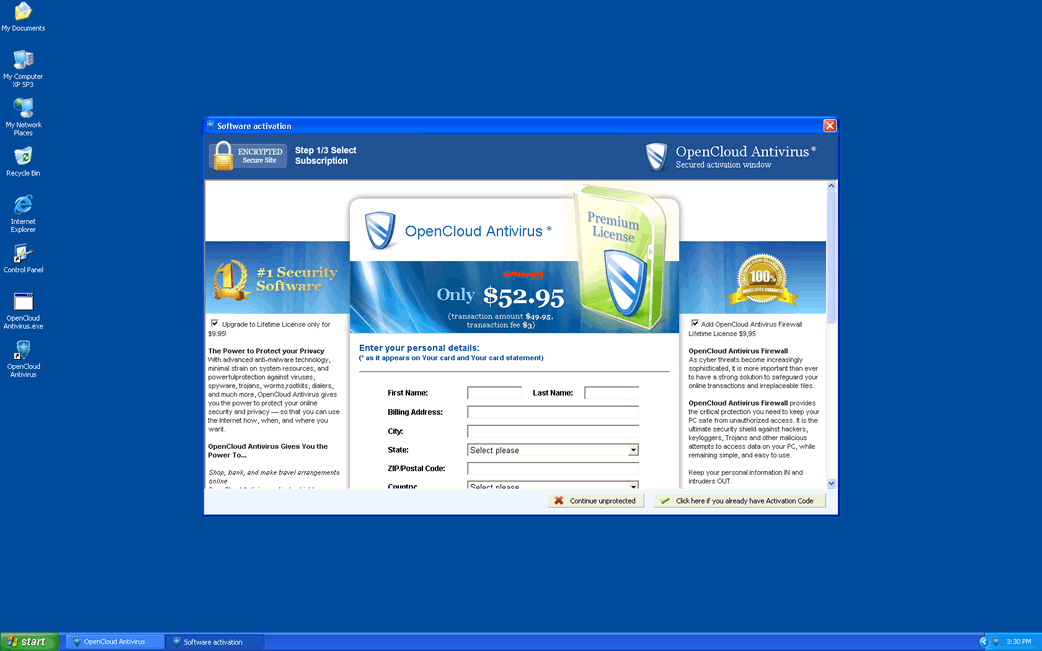 ESG PC security researchers have identified OpenCloud Antivirus as a rogue anti-virus application from the FakeScanti family. This means that OpenCloud Antivirus is a fake anti-virus tool that is designed to steal your money and credit card details. The OpenCloud Antivirus interface attempts to resemble popular anti-virus software. This fake anti-virus program displays a continuous stream of fake security alerts and virus warnings in an attempt to convince its victim to pay for fixing these nonexistent issues. OpenCloud Antivirus is also associated with browser redirecting and blocked access to your legitimate anti-virus programs. ESG PC security researchers recommend automatically removing the OpenCloud Antivirus rogue security program with a legitimate anti-virus program.