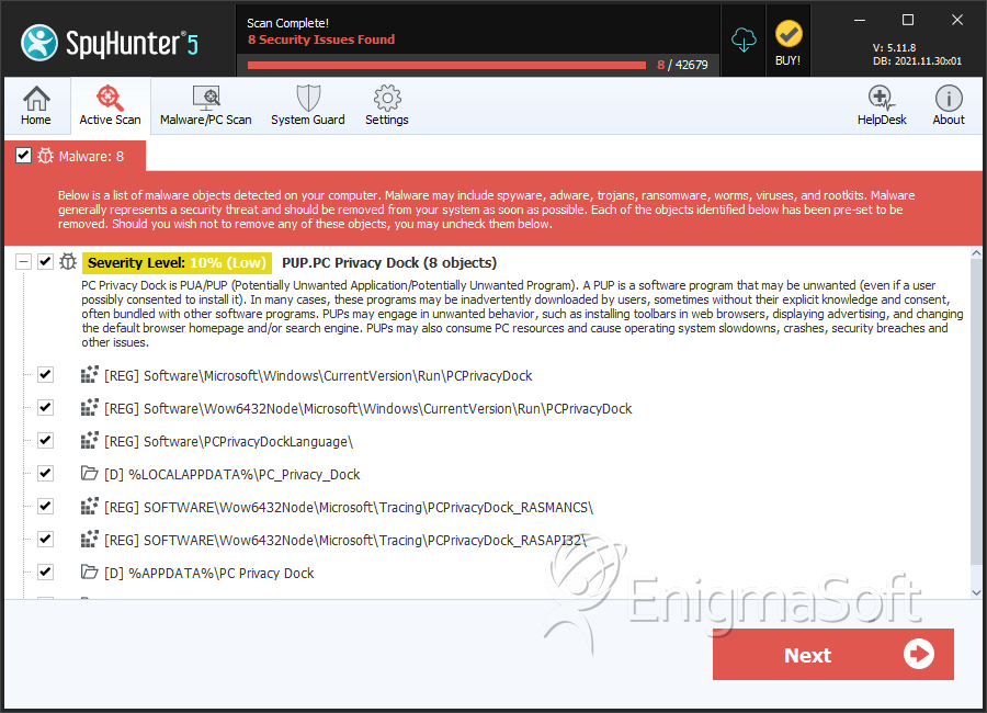 PC Privacy Dock is marketed as a way for computer users to delete any compromising information from a computer. Essentially, PC Privacy Dock is advertised as an enhancing privacy tool. As soon as PC Privacy Dock is installed, it claims to run a full scan of the affected computer. No matter the state of the affected computer, PC Privacy Dock will always claim to have found numerous problems that endanger the computer user's privacy. When PC users try to remove these supposed 'problems' using PC Privacy Dock, additional error messages claiming that it is necessary to pay for a 'full version' or a 'licensed version' of PC Privacy Dock will appear. PC Privacy Dock may not provide any kind of useful service; any negative results displayed by PC Privacy Dock may be either greatly exaggerated or outright lies. The purpose of PC Privacy Dock is not to protect the computer users' privacy but to convince them to pay for a bogus upgrade by using social engineering techniques.