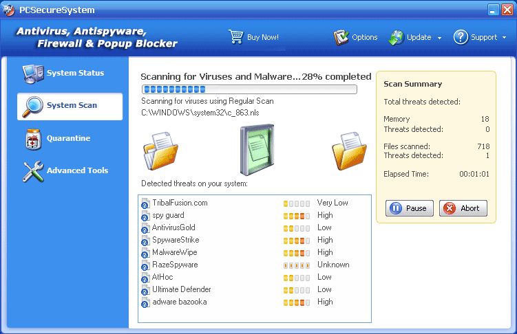 A rogue anti-spyware application that utilizes simple but effective scare tactics in order to intimidate you into purchasing the full commercial version of the software, PCSecureSystem achieves such results by showing you misleading scan results and false pop-up security alerts. PCSecureSystem typically finds its way into your system due to Trojans, browser security exploits or manual download and installation.![]()
