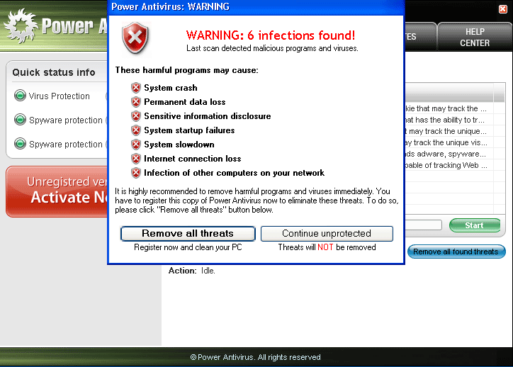 Once installed, Power Antivirus 2009 generates fake popups and system alert messages stating the user's computer is infected with spyware. Power Antivirus 2009 is also able to generate a rogue computer system scan and display erroneous spyware results. These scare tactics are only used by Power Antivirus 2009 to push the user into purchasing Power Antivirus 2009's full version.