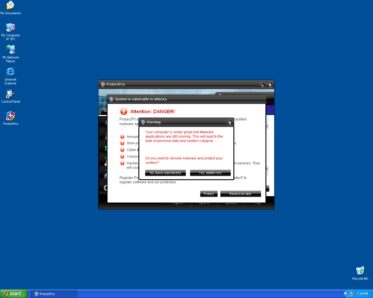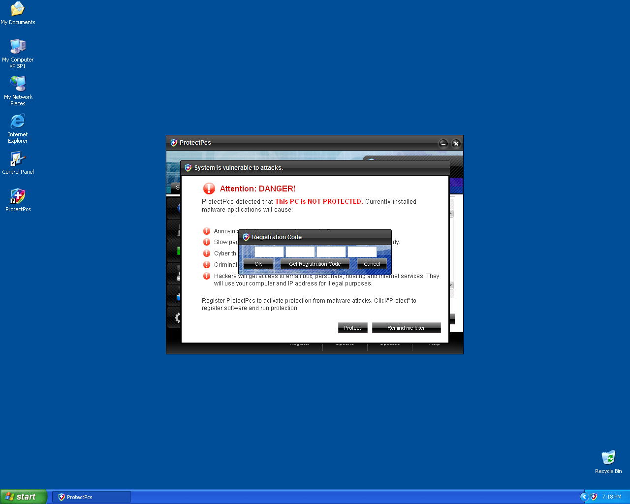 ProtectPcs is a rogue security application from the FakeSmoke family. ProtectPcs is distributed by Trojans that enter users' systems via vulnerability exploits or malicious downloads. The Trojan sets ProtectPcs to automatically run each time a user restarts his/her Windows system. The Trojan will also create numerous harmless files in different locations, which are later detected as malware when ProtectPcs conducts a fake system scan. ProtectPcs will also display pop-up adverts and fake virus alert notifications in order to convince victims that their computers are seriously infected. Users are advised to ignore all scan reports and notifications displayed by ProtectPcs and by no means purchase the "full version" of ProtectPcs.