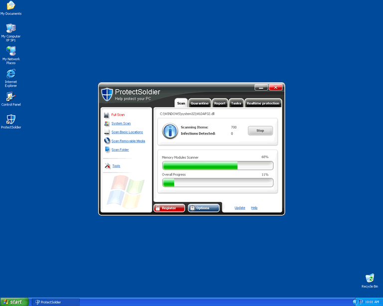 ProtectSoldier or Protect Soldier, is a variant of the FakeSmoke family of rogue anti-spyware applications. ProtectSoldier can be very deceiving in the way that it will display misleading popups after installation. In addition, ProtectSoldier is known to initiate system scans for parasites only to return several unidentified or bogus results.ProtectSoldier is not a trusted security application because it is not able to detect and remove parasites as it claims to. If left installed, ProtectSoldier could damage or corrupt system registry entries causing the computer to drastically slow down or become unstable.