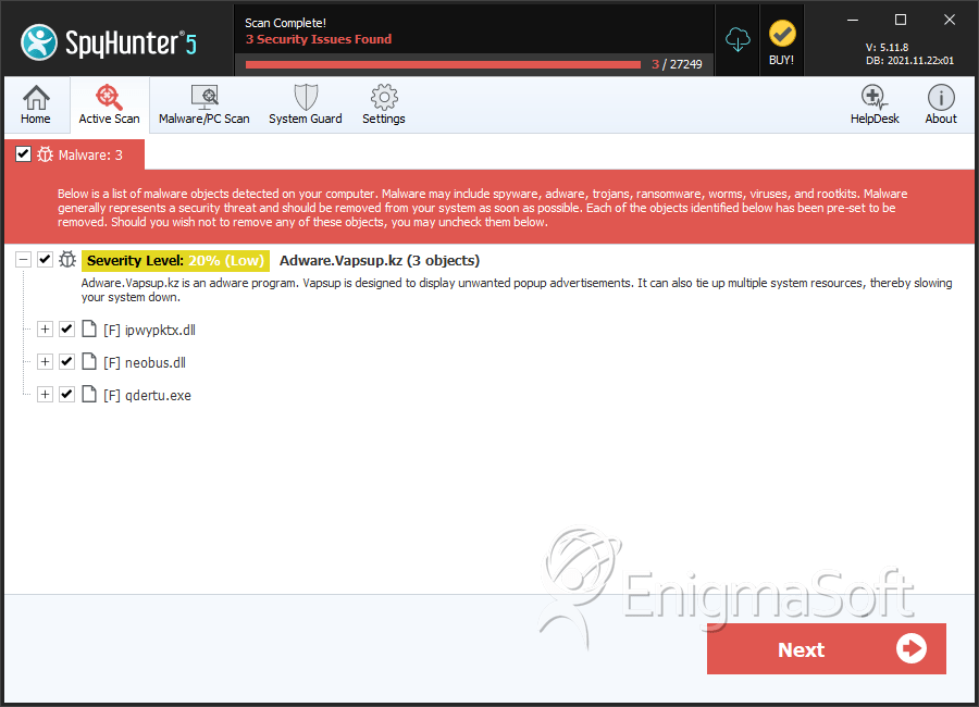 SpyHunter detecta e remove Adware.Vapsup.kz