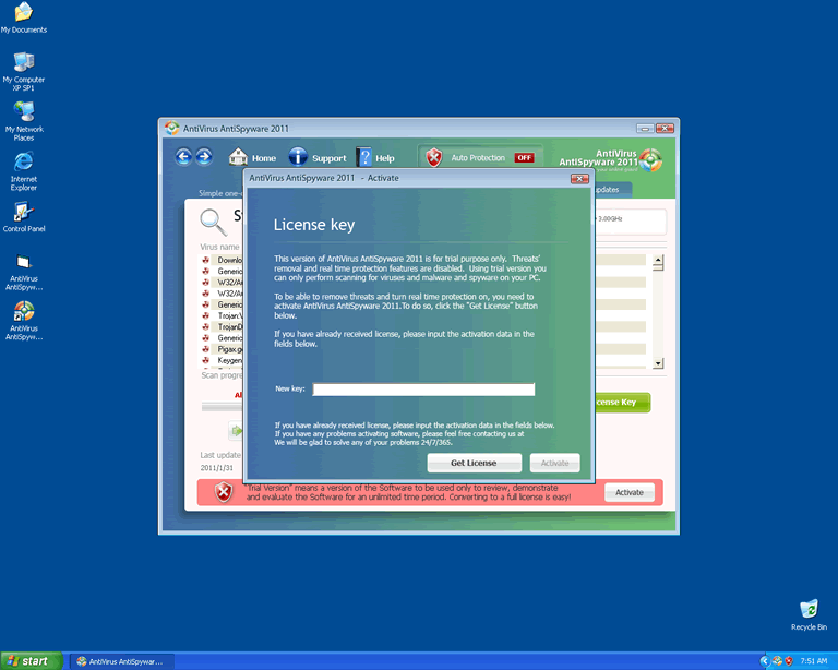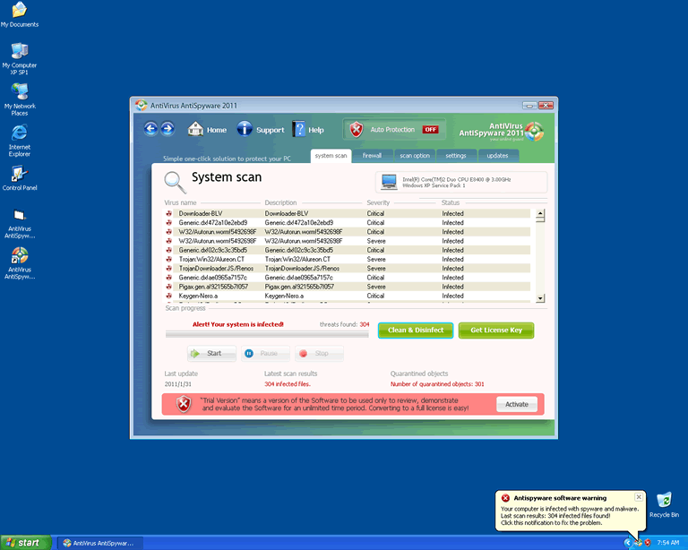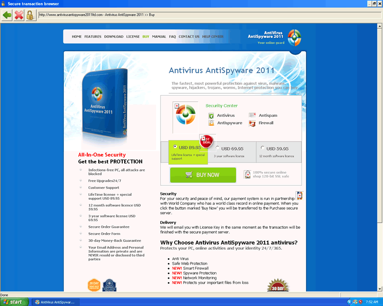 O AntiVirus Antispyware 2011 tornará sua presença óbvia em um computador infectado. Isso ocorre porque o AntiVirus Antispyware 2011 é parte de um esquema, que tenta assustá-lo e faze-lo pensar que a segurança do seu computador está em perigo e que sua única opção de autodefesa é pagar pelo AntiVirus Antispyware 2011. Então, os criminosos pegam seu dinheiro , e você não ganha nada, porque o AntiVirus Antispyware 2011 é incapaz de detectar ameaças ou removê-las. Se o AntiVirus Antispyware 2011 estiver no seu computador, não haverá dúvidas, porque o AntiVirus Antispyware 2011 tentará assustá-lo muito, muito mesmo.