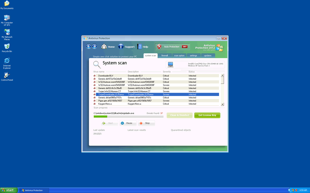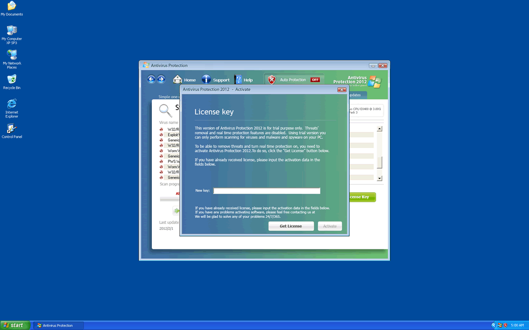 O Antivírus Protection 2012 foi projetado para exibir mensagens de erro e alertas que parecem ser autênticos, indicando a presença de malware no computador da vítima. No entanto, os pesquisadores de segurança do ESG desaconselham prestar atenção a qualquer um desses avisos, uma vez que o próprio Antivirus Protection 2012 é uma infecção por malware e não tem como detectar ou remover malware. Esse falso programa de segurança insere links que levam aos seus diversos sites para tentar direcionar suas vítimas a um formulário pedindo informações do cartão de crédito da vítima, em troca de um código de registro inútil para a sua versão completa que não existe. Descobriu-se que o código de registro LIC2-00A6-234C-B6A9-38F8-F6E2-0838-F084-E235-6051-18B3 diminui alguns dos sintomas desse programa segurança desonesto, enquanto você usa uma ferramenta anti-malware confiável para removê-lo do seu computador.![]()