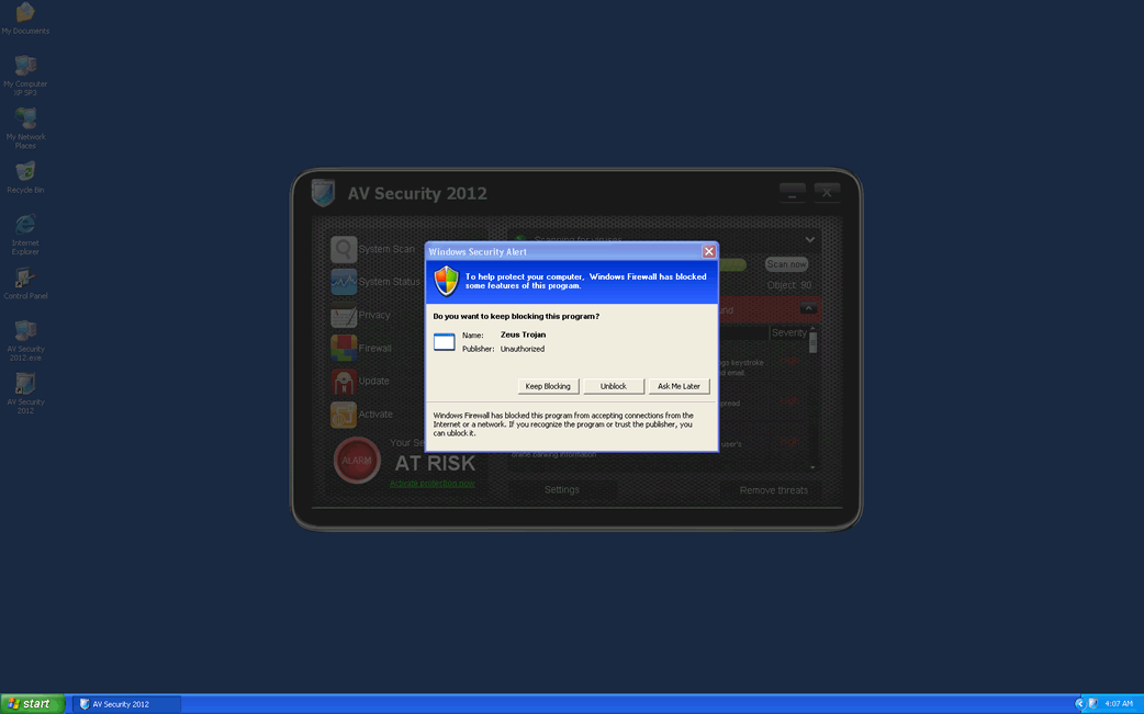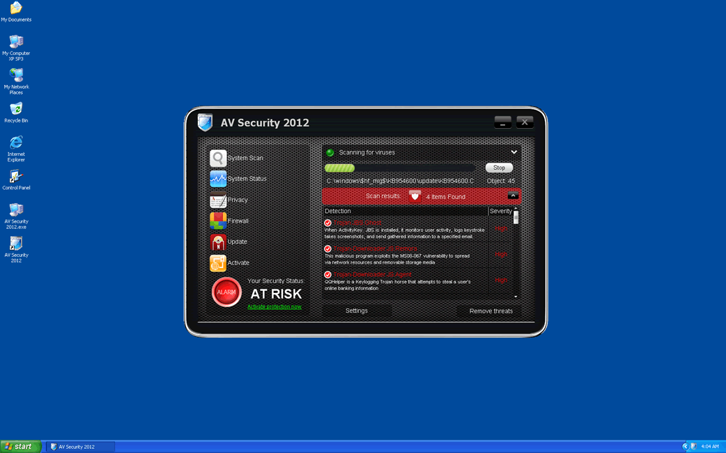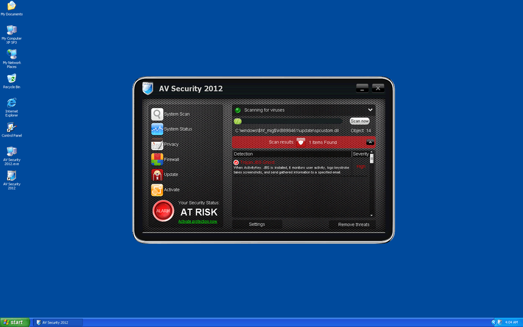 O falso programa de segurança AV Security 2012 pertence à família FakeScanti de programas anti-virus desonestos, também conhecida como WinAVPro. O AV Security 2012 finge ser um programa de segurança legítimo, mas, na verdade, está ligado a um Trojan que é parte de um esquema on-line bem conhecido. O AV Security 2012 não está sozinho; existem dezenas de versões de falsos aplicativos anti-vírus (também conhecidos como programas anti-spyware desonestos) vinculados a essa ameaça maliciosa. Sabe-se que esses falsos programas de segurança apareceram desde pelo menos 2009 e provavelmente antes. O AV Security 2012 faz parte de um lote de clones desses programas anti-virus desonestos que adicionam o ano "2012" no final dos seus nomes. Esses clones começaram a aparecer no Outono de 2011, aproveitando o ano novo. Os analistas de malware do ESG aconselham fortemente não cair no esquema do AV Security 2012.