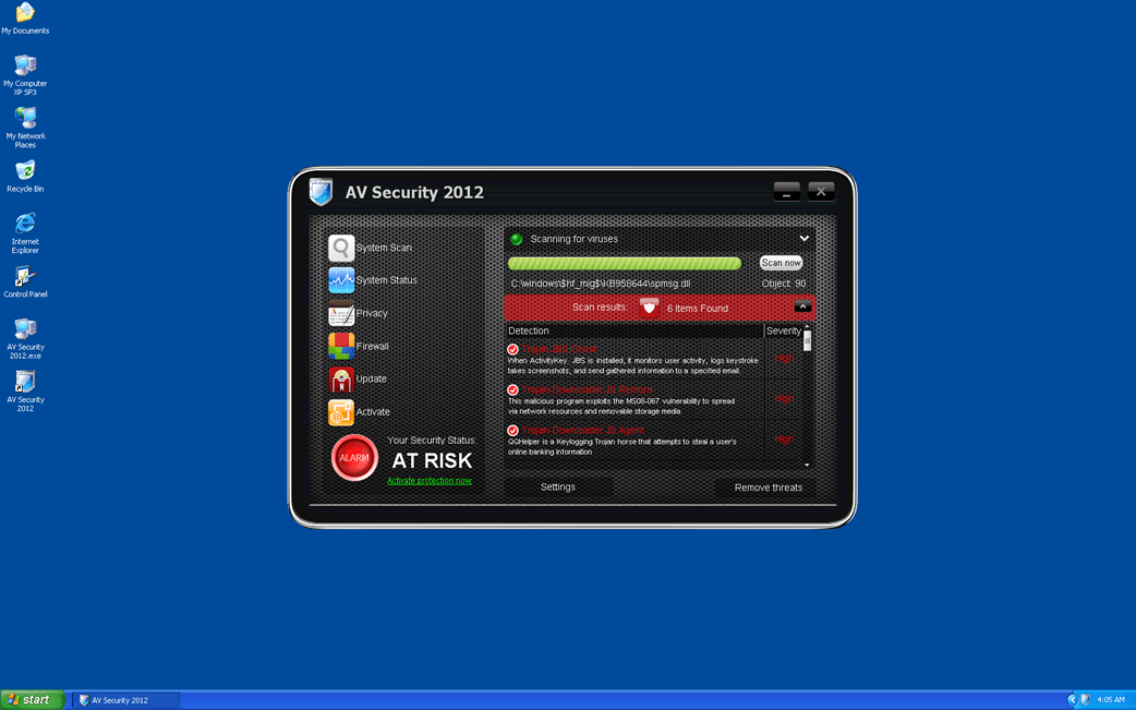 Apesar do nome, o AV Security 2012 não oferece absolutamente nenhuma proteção anti-vírus. Na verdade, o AV Security 2012 é classificado como uma infecção por malware, uma vez que ele contém todas as características previamente identificadas de uma ameaça à segurança. O AV Security 2012 usa uma varios scripts maliciosos e Trojans para causar danos ao sistema do computador infectado. Conhecidos clones do AV Security 2012 incluem Security Guard, Sysinternals Antivirus, Wireshark Antivirus, Milestone Antivirus, WolfRam AntiVirus, OpenCloud Antivirus, OpenCloud Security, OpenCloud AV, Super AV 2013. Esses falsos programas de segurança também tem versões com o sufixo "2011". Não caia nesse esquema; o AV Security 2012 é o mesmo falso aplicativo de segurança, idêntico às suas versões anteriores, com apenas ligeiras alterações feitas à sua aparência exterior.