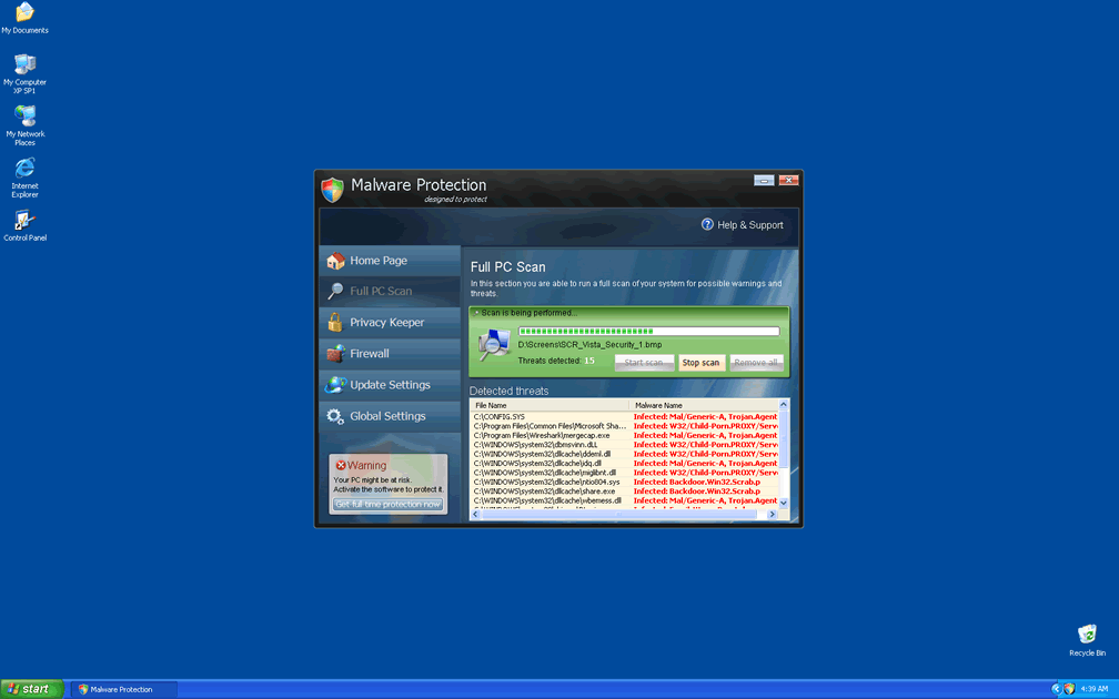 Falsas digitalizaçōes do sistema e alertas de segurança são essenciais para o Malware Protection tentar tomar o dinheiro dos usuários dos computadores infectados. O Malware Protection se configura para ser executado sempre que o Windows for iniciado e cada vez que o Malware Protection é executado, ele exibe um falso interface e executa a sua falsa digitalização. O interface parece bastante realista, e foi desenvolvido para se parecer com uma janela no Windows XP. No entanto, as digitalizaçōes executadas nesse interface não são nada mais do que de animações, e as listas dos resultados são falsas e pré-escritas. Depois de cada uma dessas "digitalizaçōes", o Malware Protection vai dizer que a única forma de proteger o seu PC é ativando o Malware Protection mediante o pagamento de uma taxa. Em vários locais do interface do Malware Protection isso é mencionado como "Proteção máxima", como se o Malware Protection fosse uma camada extra de proteção, além da que já é fornecida pelo Microsoft Security Essentials.