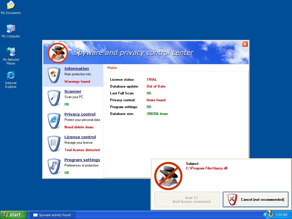 O Spyware e Privacy Control Center é um falso programa anti-spyware que é baixado e instalado através do Trojan Zlob. Após a instalação do Spyware and Privacy Control Center ter ocorrido, você pode receber um grande número de notificações popup e alertas de sistema ilícitos, que tentam avisá-lo sobre problemas de segurança ou parasitas. O Spyware e Privacy Control Center usa estas táticas, além de falsas varreduras de sistema, para convence-lo a comprar a versão completa do seu programa. Ele não é muito diferente de outros aplicativos maliciosos. O Spyware e Privacy Control Center não é um aplicativo de segurança legítimo e não é capaz de detectar ou remover parasitas.![]()