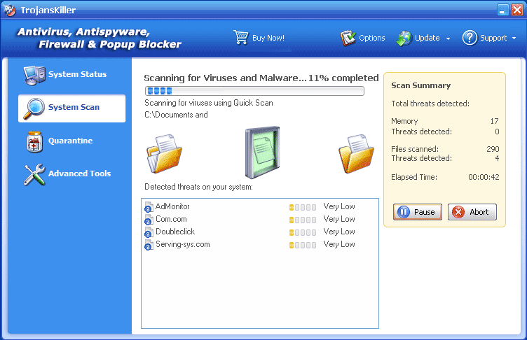 O TrojansKiller é um programa anti-spyware nocivo, que não pode realmente detectar nem remover parasitas de spyware do seu computador. O TrojansKiller pode ser secretamente instalado no seu sistema, através de vários mecanismos de antiéticos. O TrojansKiller pode escanear o seu PC e emitir falsos resultados positivos para tentar assustá-lo e faze-lo comprar a sua versão completa. O TrojansKiller não é uma ferramenta reconhecida de remoção de spyware, por isso não deve permanecer no seu sistema.