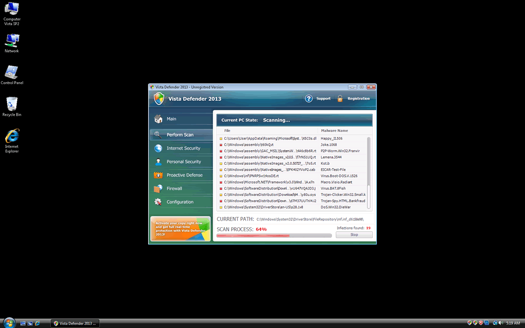 Como a maioria dos programas de segurança desonestos, o Vista Defender 2013 tenta assustar a vítima para faze-la comprar um falso programa anti-vírus. Ele consegue isso fazendo o computador da vítima se comportar de forma errática e bloqueando o acesso à Internet e aos arquivos da vítima. O principal sintoma de uma infecção pelo Vista Defender 2013 é um grande número de alertas do sistema, mensagens de erro e notificações pop-up da barra de tarefas. Todas elas aparecem constantemente, solicitando que a vítima faça o download de uma versão' completa' do Vista Defender 2013 a fim de remover uma infecção inexistente no computador da vítima. Os pesquisadores de segurança do ESG desaconselham fortemente acreditar em qualquer uma das mensagens de erro exibidas pelo Vista Defender 2013, porque o Vista Defender 2013 não tem como defender o computador contra malware e é na verdade uma infecção por malware.![]()