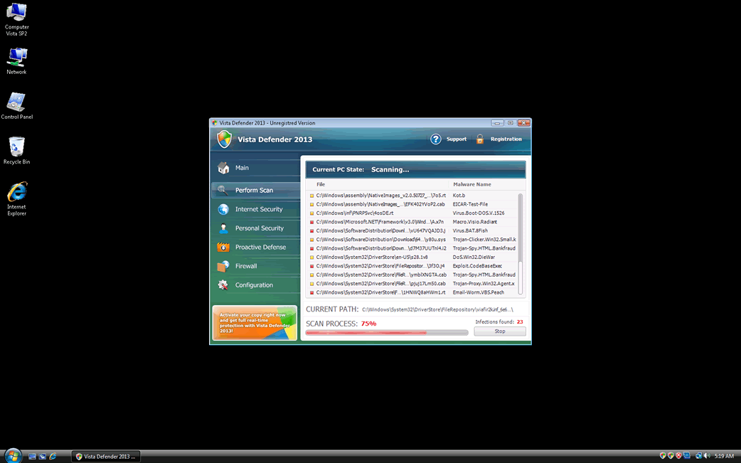 O Vista Defender 2013 e seus clones são conhecidos principalmente porque eles podem se adaptar aos diferentes sistemas operacionais. O Vista Defender 2013 é um falso programa de segurança que só ataca computadores que usam o sistema operacional Windows Vista (o Vista Defender 2013 raramente aparecerá em computadores com outras versões do Windows; esses casos são muito raros). Se o computador da vítima estiver executando o Windows XP ou o Windows 7, então o computador da vítima será atacado pelas duas variantes correspondentes, ou seja, o XP Defender 2013 ou o Win 7 Defender 2013. Isso acontece porque parte do processo de instalação do Vista Defender 2013 envolve detectar o sistema operacional da vítima para baixar o seu correspondente programa de segurança desonesto.