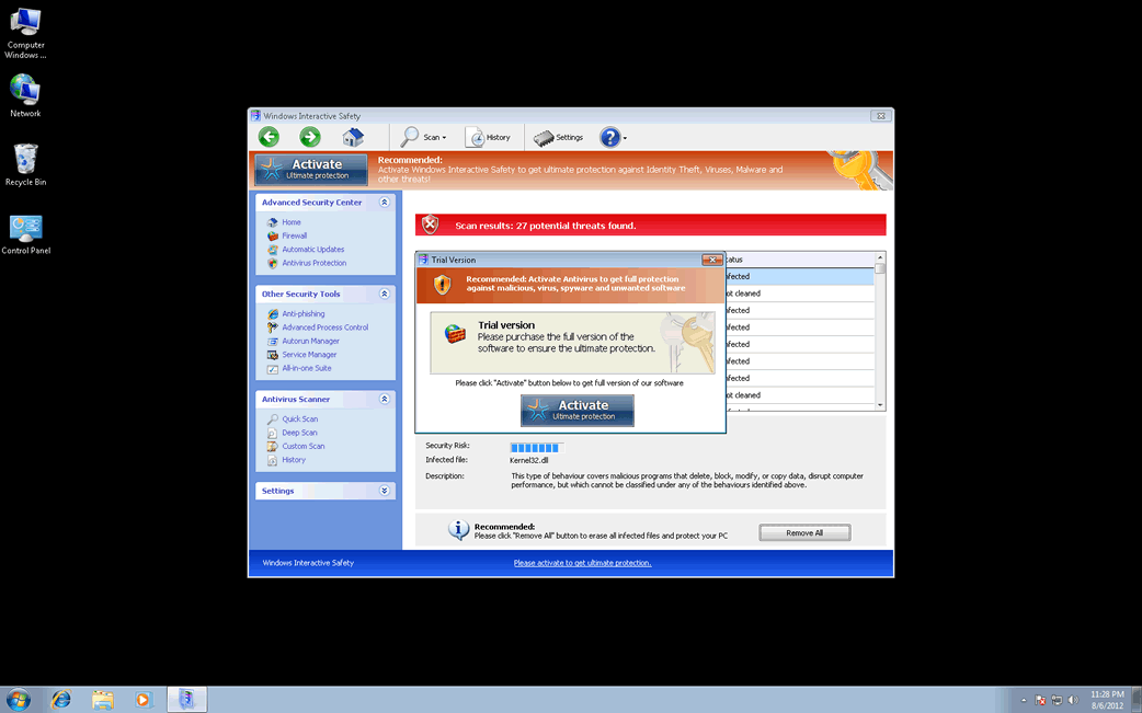 Para aplicar o seu golpe, esses programas vão fingir ser legítimos aplicativos anti-spyware. No entanto, ao contrário de um verdadeiro anti-spyware, eles sempre indicarão que o seu computador está corrompido por malware, sem levar em conta o estado real do computador. Então, eles tentarão fazer parecer que você precisa adquirir uma cara atualização para a 'versão completa' do Windows Interactive Safety se você deseja remover essas falsas infecções do seu computador. Programas como o Windows Interactive Safety são projetados para perseguir as suas vítimas com constantes e alarmantes mensagens de erro e com o redirecionamento do navegador, o que se torna um aborrecimento além de um sério obstáculo ao tentar operar a máquina infectada.