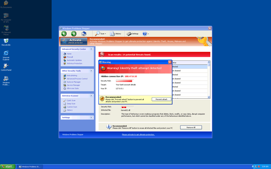 Os criminosos usam o Windows Problems Stopper e falsos programas de segurança semelhantes, a fim de convencer os usuários de computador que eles precisam adquirir ferramentas de segurança inúteis. De acordo com os analistas de segurança do PC do ESG, o Windows Problems Stopper faz parte de um ataque de malware com multi-componentes. Basicamente, o Windows Problems Stopper infecta um computador e faz alterações críticas nas configurações do Registro do Windows e do sistema. Essas alterações permitem que o Windows Problems Stopper seja iniciado automaticamente e exiba mensagens de erro que imitam as mensagens de erro legítimas do Windows. Uma vez que o computador infectado é reiniciado, o Windows Problems Stopper é iniciado automaticamente e exibe uma falsa digitalização do sistema alegando que o computador foi severamente infectado. Em seguida, o Windows Problems Stopper vai continuar a incomodar a vítima com uma enxurrada de falsas mensagens de erro e avisos, aumentando a ameaça até que a vítima entre em pânico acreditando que o seu computador está à beira de um colapso total. Finalmente, o Windows Problems Stopper direciona suas vítimas para um site onde o Windows Problems Stopper oferece uma 'versão completa' do Windows Problems Stopper a fim de corrigir esses problemas inexistentes. Obviamente, dar o seu dinheiro a criminosos não é uma boa idéia; em vez disso, remova o Windows Problems Stopper logo que possível.![]()