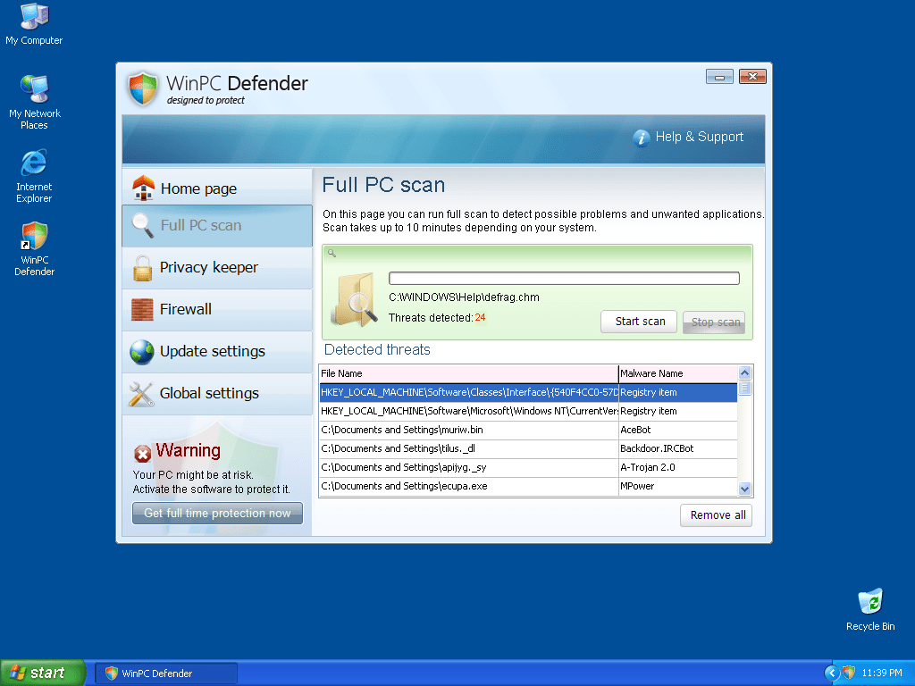 O WinPC Defender, ou WinPCDefender, é um programa anti-spyware desonesto. O WinPC Defender é geralmente instalado no sistema de computador do usuário com a ajuda do trojan Zlob, ou o usuário pode te-lo baixado visitando um site malicioso. Uma vez instalado, o usuário pode receber irritantes notificações de popups de falsas infecções de spyware. Estas falsas notificações redirecionam o usuário para sites fraudulentos que vendem o WinPC Defender como um software legítimo. O WinPC Defender não é capaz de detectar nem remover qualquer infecções de spyware. O WinPC Defender é uma infecção em si.
