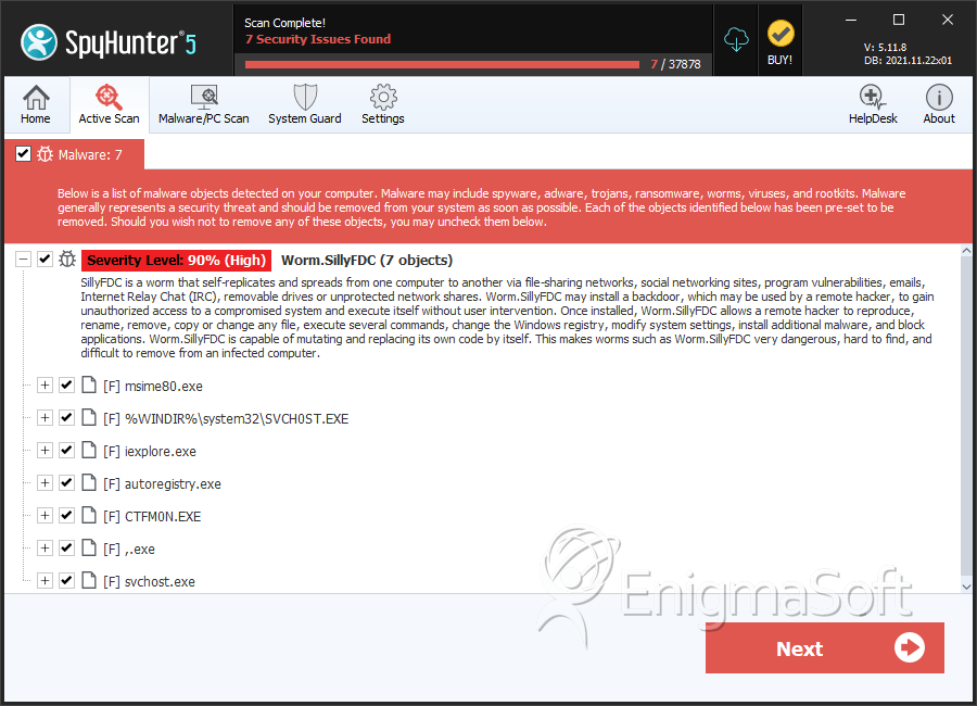SpyHunter detecta e remove Worm.Small.ADMH