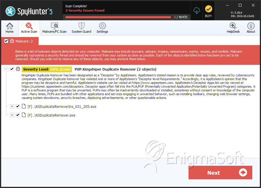 SpyHunter Detects & Remove PUP.Kingshiper Duplicate Remover