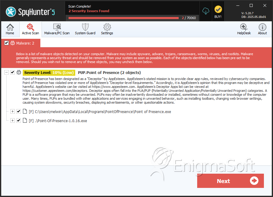 SpyHunter Detects & Remove PUP.Point of Presence