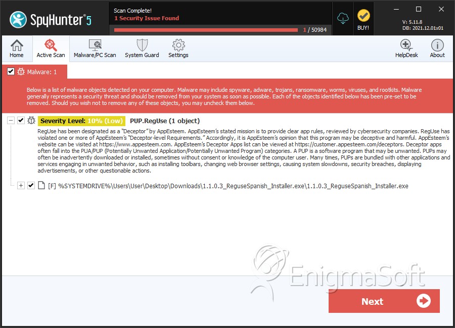 Ranking: The ranking of a particular threat in EnigmaSoft’s Threat Database.