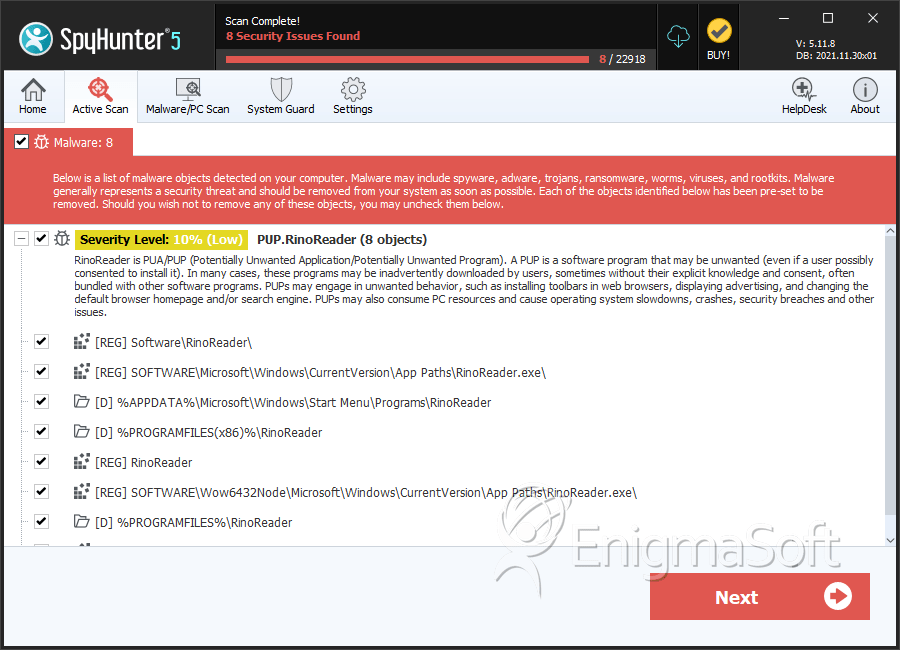 The main problem with RinoReader is that RinoReader delivers numerous advertisements to the affected Web browser. These advertisements may take the form of pop-up advertisements, and may promote known misleading tactics or other PUPs. They also may interrupt the computer user's activity, affecting productivity and making it very difficult to use the affected Web browser effectively. RinoReader may affect the computer's operating system and performance. RinoReader may make changes that allow RinoReader to run automatically when Windows starts up and will execute in the background, utilizing system resources and affecting the computer's performance. Another issue with RinoReader is that RinoReader may interfere with how the affected Web browser loads Web pages or connects to the Internet, and cause the affected Web browser to be slower and prone to crashing or freezing.