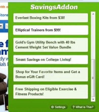 Savings Addon is an adware application that shows a variety of coupons offers and pop-up advertisements on well-known websites, mostly online shopping websites, such as Amazon, eBay, Walmart and others. Savings Addon is mainly inserted into Internet Explorer, Mozilla Firefox and Google Chrome Internet browsers while web users are downloading some other applications. Commonly, Savings Addon is packaged with free software products. Savings Addon may trace the attacked PC user's browsing activities and then use this information for marketing intentions. Savings Addon can access victimized computer systems without the target computer owner's consent and awareness; therefore, it is definitely an unwanted application that has to be uninstalled from the compromised PC with a genuine anti-malware program.