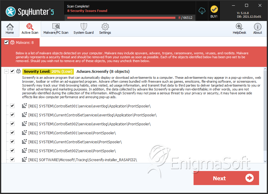 Moreover, the Screenify adware may install itself as a module to the Microsoft .NET Framework, which third-party programs use to load images, videos, text and raw data. That way, the Screenify adware can inject advertisements in the processes of other applications, and you may see banners and pop-up windows loaded with commercials while playing games and making a report on Microsoft Word. The Screenify adware may cause program crashes and slow down your PC. Security analysts note that Screenify adware may be resistant to manual removal by creating Registry keys that hide its files and prevent the user from killing the screenify.exe process via the Windows Task Manager. The Screenify adware is similar to WikiTime and Serpens and may edit the DNS configuration of the infected computer to reroute the victim's Web traffic to the servers of advertisers. Computer users that wish to keep their Internet habits private and shop securely would need to remove the Screenify adware with the help of a trusted anti-spyware tool.