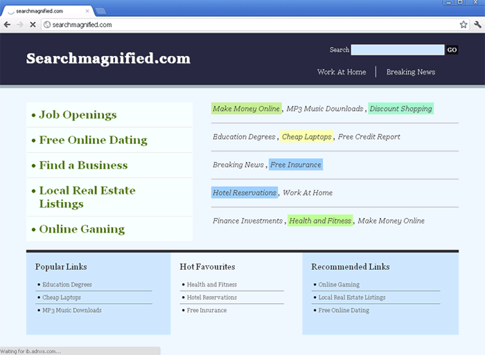 So, why would anyone want to use SearchMagnified.com for their online searches when such websites as Google, Yahoo or Bing are freely available? Well most computer users that end up at SearchMagnified.com have no way of staying away from this website. Websites like SearchMagnified.com are associated with a type of malware known as a browser hijacker. Browser Hijackers are simply malware that takes over the victim's web browser and forces it to visit a particular website repeatedly, or changes the web browser's settings to lower its security or to force it to display pop-up windows or other annoyances.