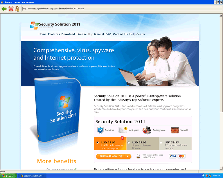 The Security Solution 2011 scam is similar to scams that are commonly carried out by most rogue security programs. This kind of scam has three main steps: