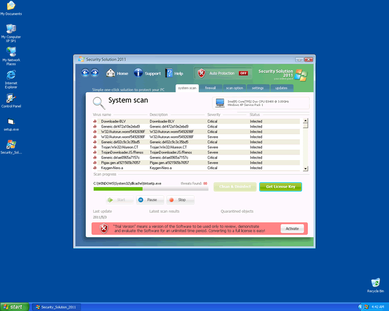 - Enforce the illusion that the victim's computer is severely infected. Security Solution 2011 creates a large number of problems on the victim's computer, in order to make the victim panic. Some of these problems include slowness, instability, frequent crashes, blocked access to executable files, frequent error messages and blocked access to the Internet browser. Security Solution 2011 also reinforces this illusion by displaying constant fake security alerts and a fake scan showing a large number of nonexistent virus problems on the victim's computer. Due to the changes that Security Solution 2011 makes to the Windows Registry, these effects cannot be bypassed without launching Windows in Safe Mode.